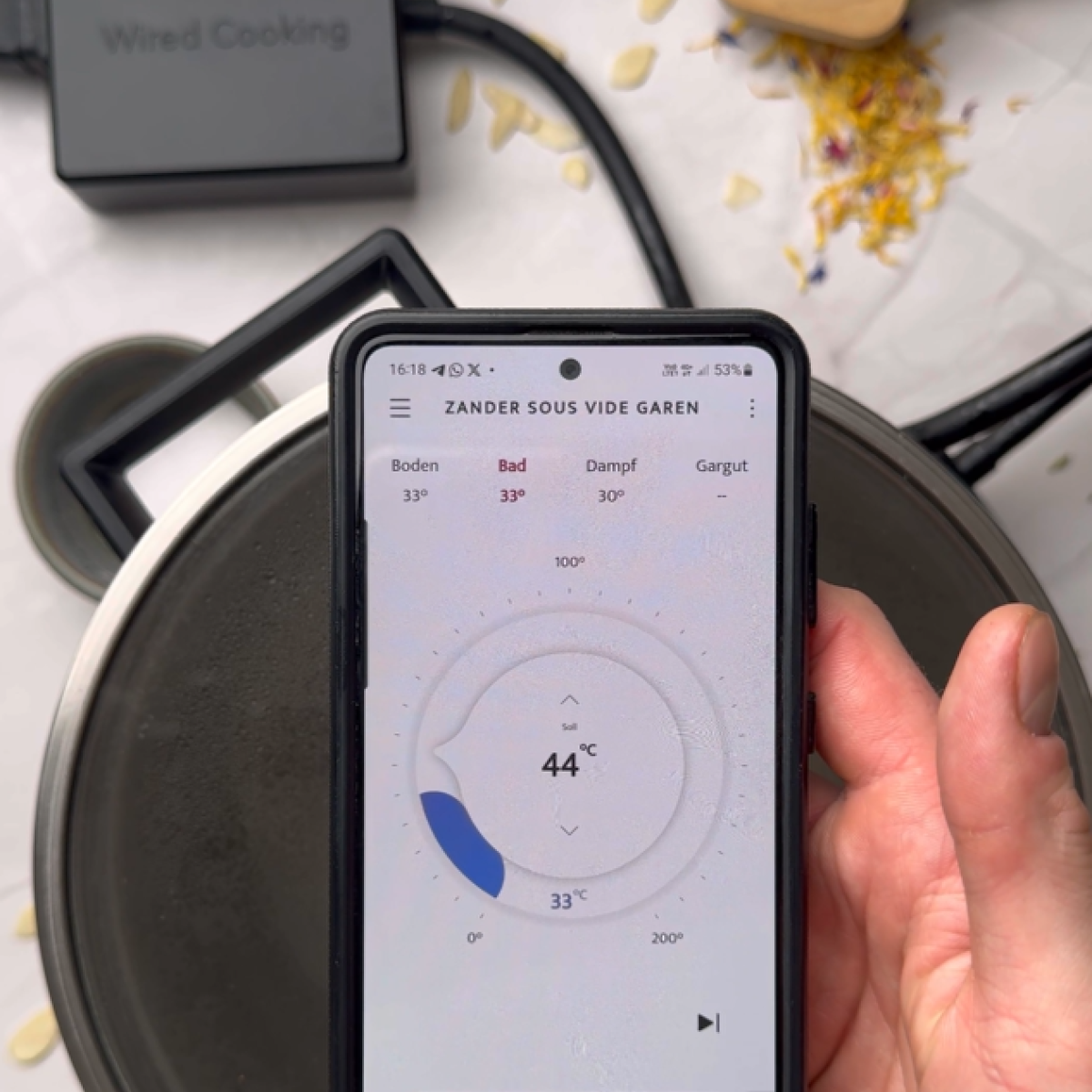 Der Wired Cooker bietet 3 Wege zum perfekten Sous-vide an. Die einfachste ist der Geräte-Ersatz, welcher ein Sous-vide-Geräte enthält. Dazu nach dem Koppeln mit dem Cooker auf 'Geräte' - 'Sous-vide-Bad' gehen. Im folgenden Schritt können Temperatur und Dauer angepasst werden. Wasser in den Topf geben, und ggf. bereits den Beutel, und starten. Es ist auch möglich, erst das Wasserbad zu tempererieren, und nach Erreichen der Zieltemperatur den Beutel zuzugeben.