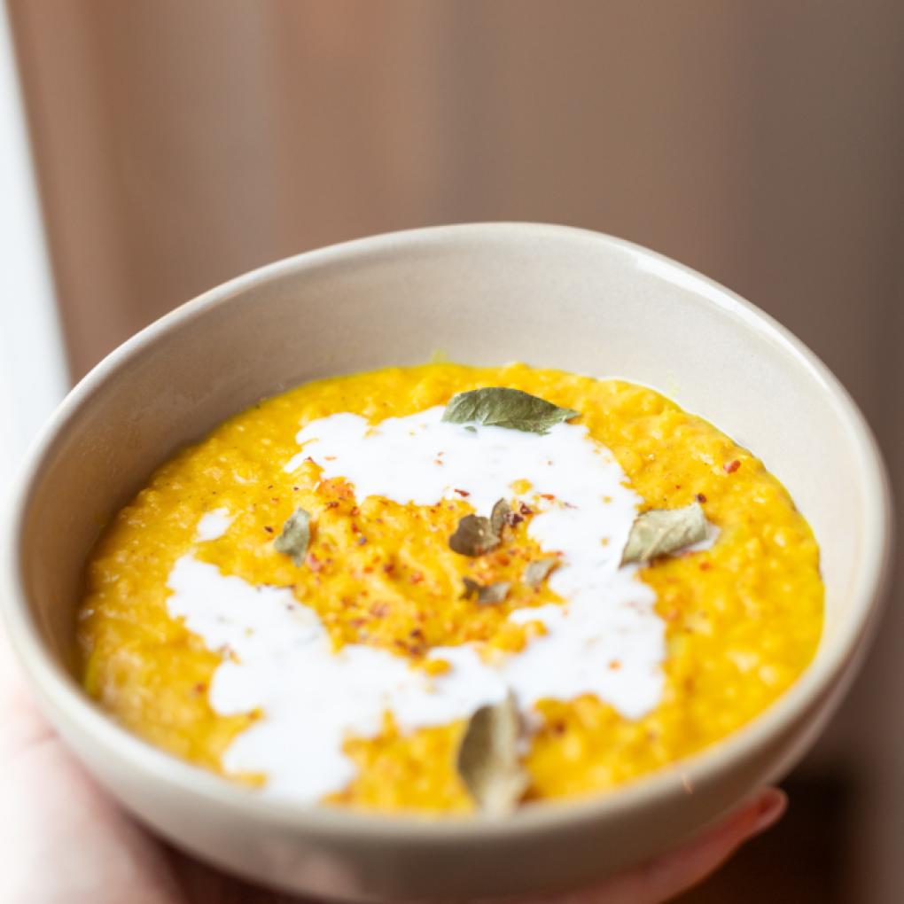 Zur Deko Kokosmilch und Curryblätter hinzugeben, mit Salz und Pfeffer abschmecken.