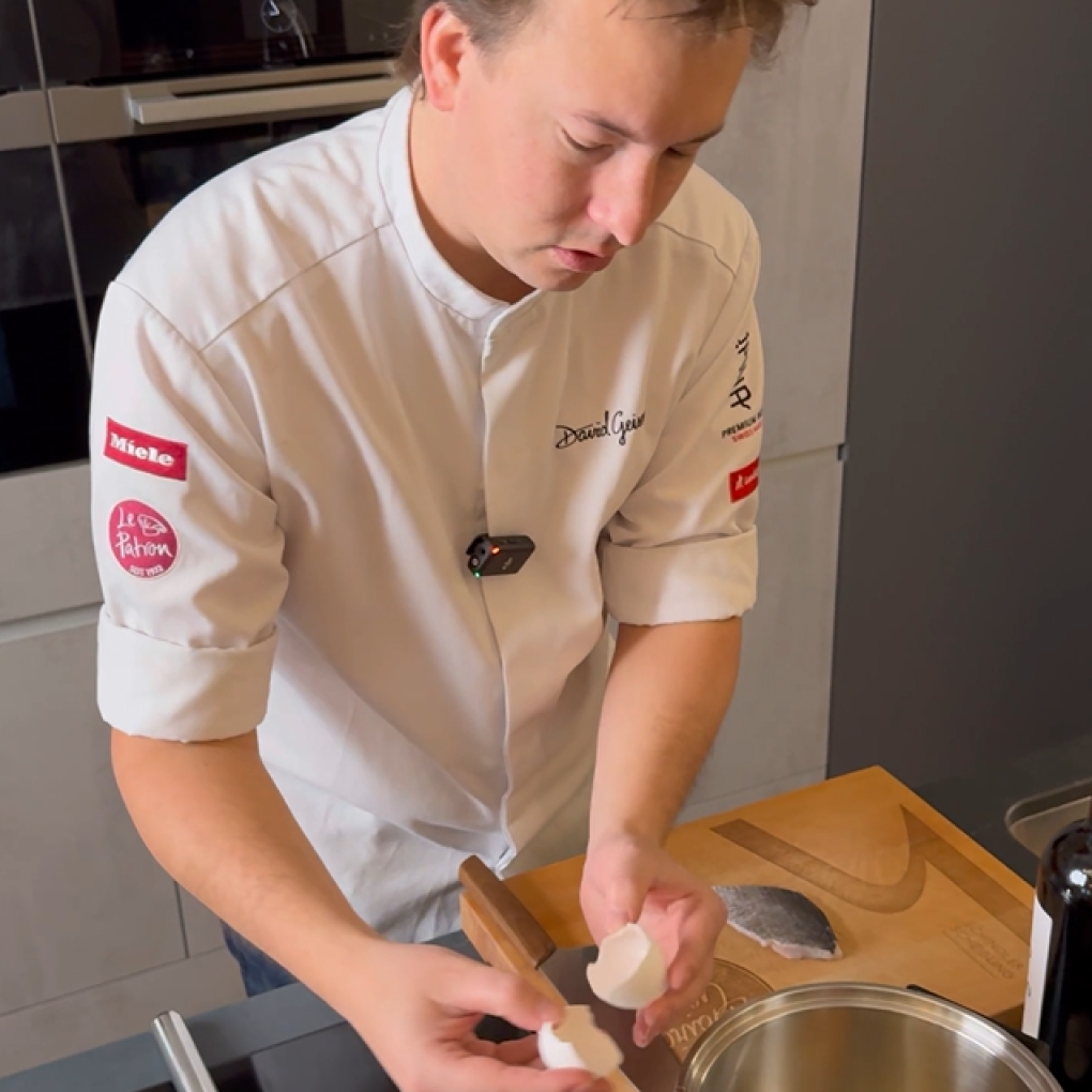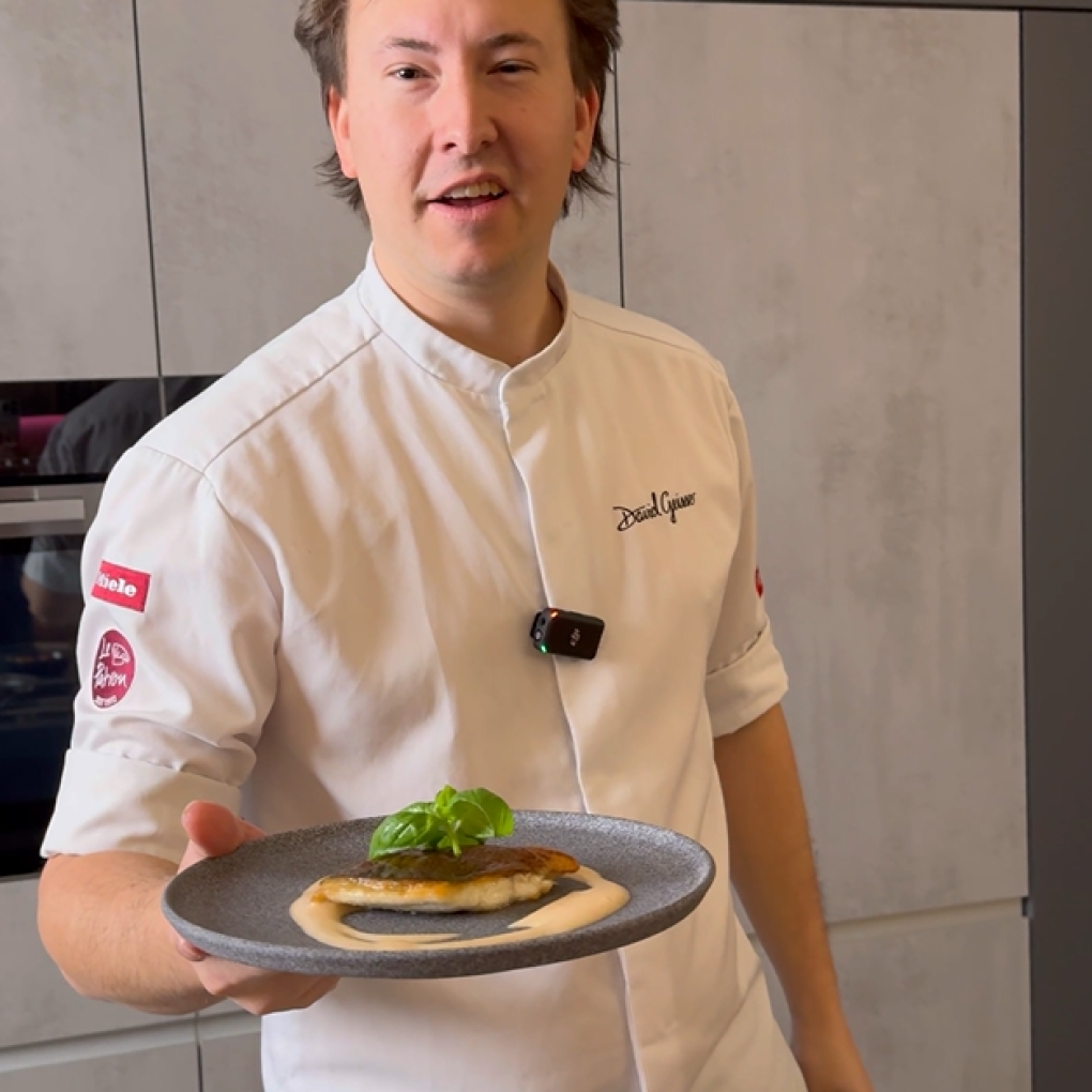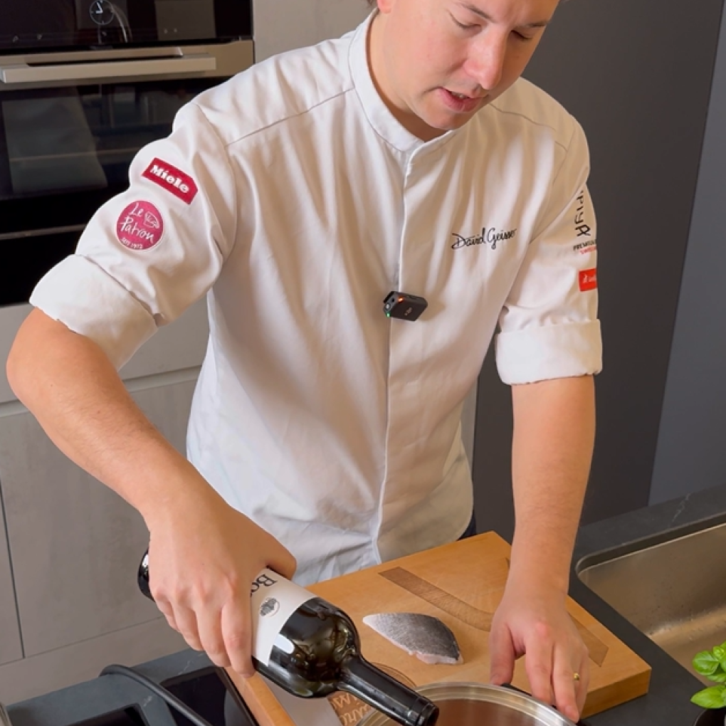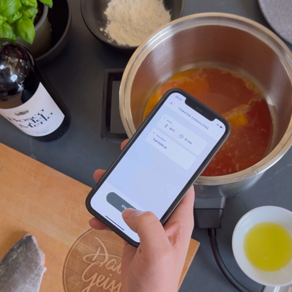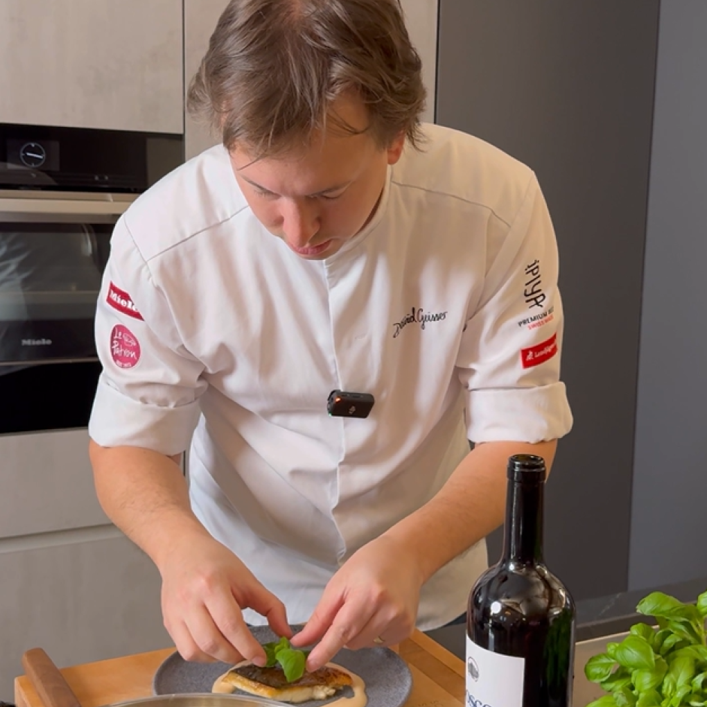 Die zwei Eigelb, den Wein, den Tomatensaft, Zitronenzesten sowie Salz und Pfeffer in den Wired Cooker geben. Die Temperatur auf konstante 80 °C einstellen, mit dem Schwingbesen schaumig schlagen und abschmecken. Die Doraden-Filets mit Salz und Pfeffer würzen und mit Mehl bestäuben. In einer beschichteten Pfanne auf der Hautseite langsam im Butter knusprig braten. Während den letzten 10 Sekunden drehen. Die Dorade sollte noch ein wenig glasig sein. Die Schaumsauce auf den Teller geben und zusammen mit der Dorade geniessen.