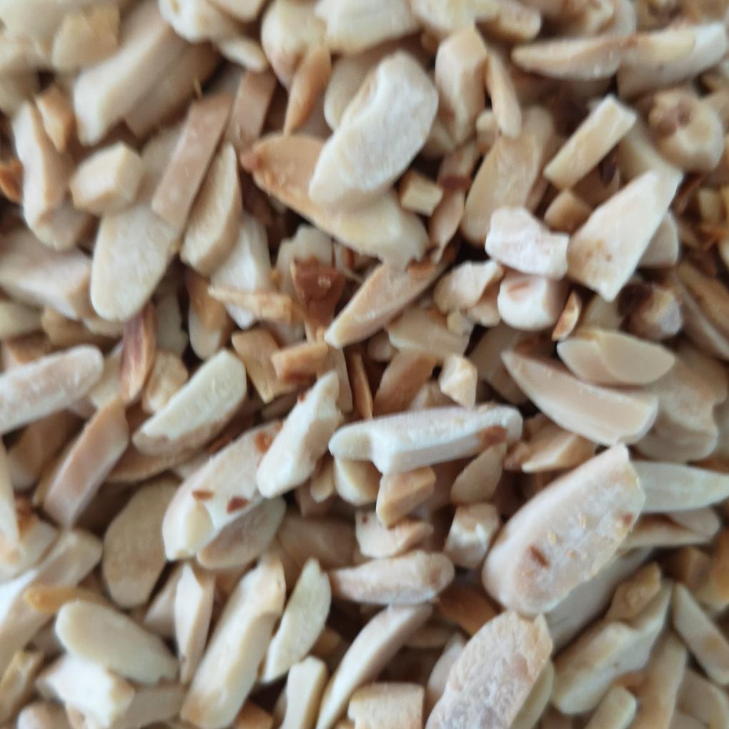 Mandelsplitter bei 200°c Bodentemperatur in gewünschter Stärke rösten.