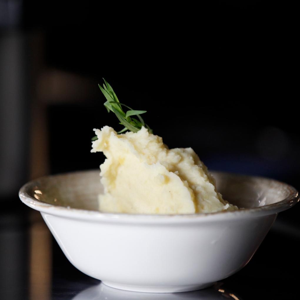 Mit dem Kartoffelstampfer die Kartoffel zerdrücken und dabei nach und nach Butter und das Rahm-Milch-Gemisch einarbeiten.