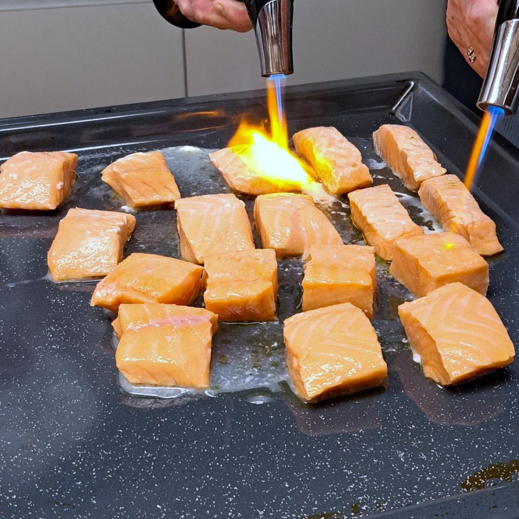 Wasserbad auf 43°C erwärmen. Lachs währenddessen zurechtschneiden und mit etwas Olivenöl vakuumieren (geht alternativ auch mit einem Frischhaltebeutel -> Luft gut herauspressen beim verschliessen). Den Vakuumbeutel mit dem Lachs nun in das Wasserbad geben und ca. 30 Minuten Sous-vide garen. Beutel herausnehmen, aufschneiden und den Lachs auf einen vorgewärmten Teller geben. Mit Salz würzen und mit einem Bunsenbrenner für etwas Röstaroma abflämmen. Nach Bedarf noch eine Minute bei 100°C Ober- und Unterhitze im Ofen etwas wärmen und direkt servieren.