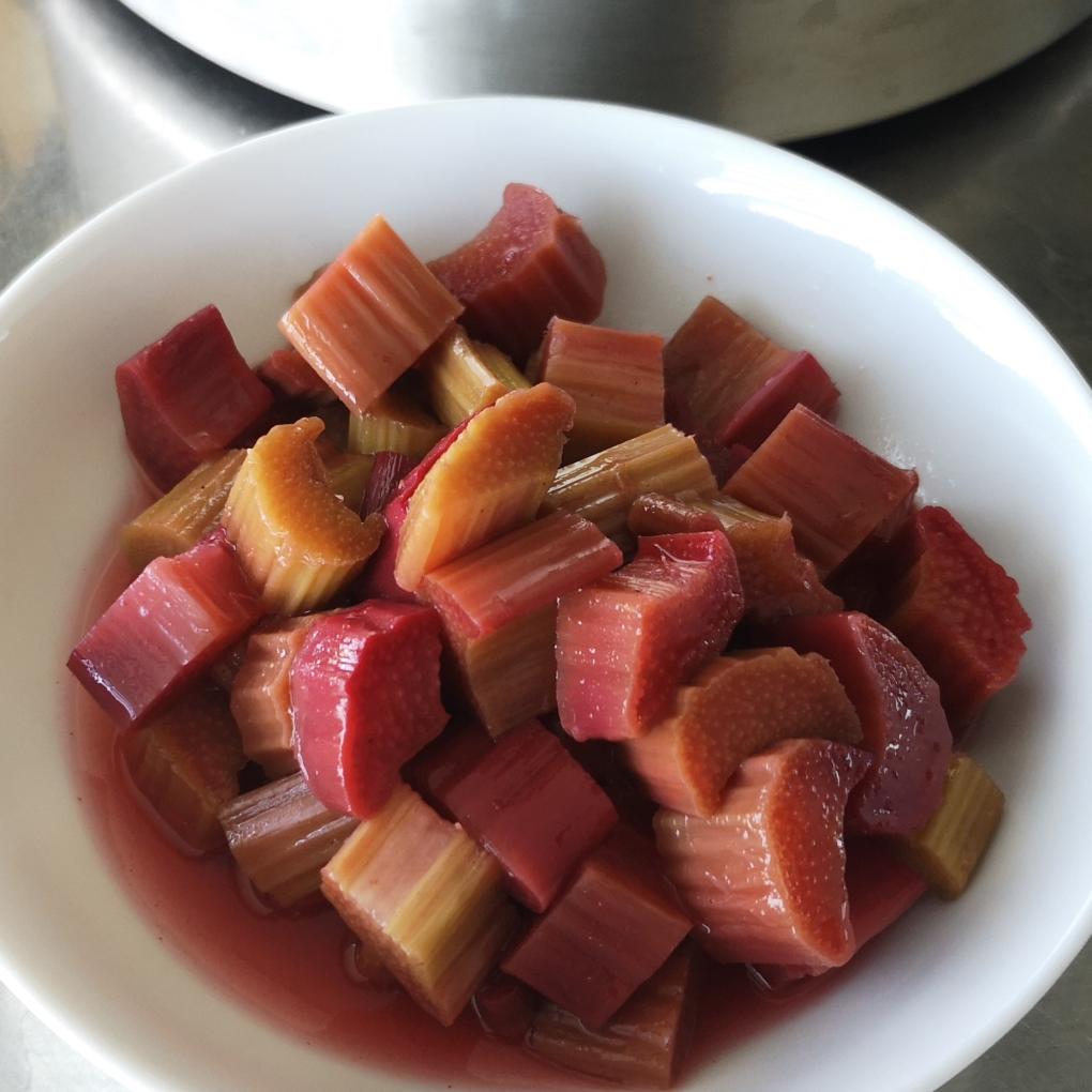 In den ersten 15 Minuten einige male umrühren, damit die Rhabarberstücke gleichmässig mit dem entstehenden Sirup mariniert werden. Anschliessend im geschlossenen Topf fertiggaren und nach etwa 2 Stunden noch lauwarm geniessen.