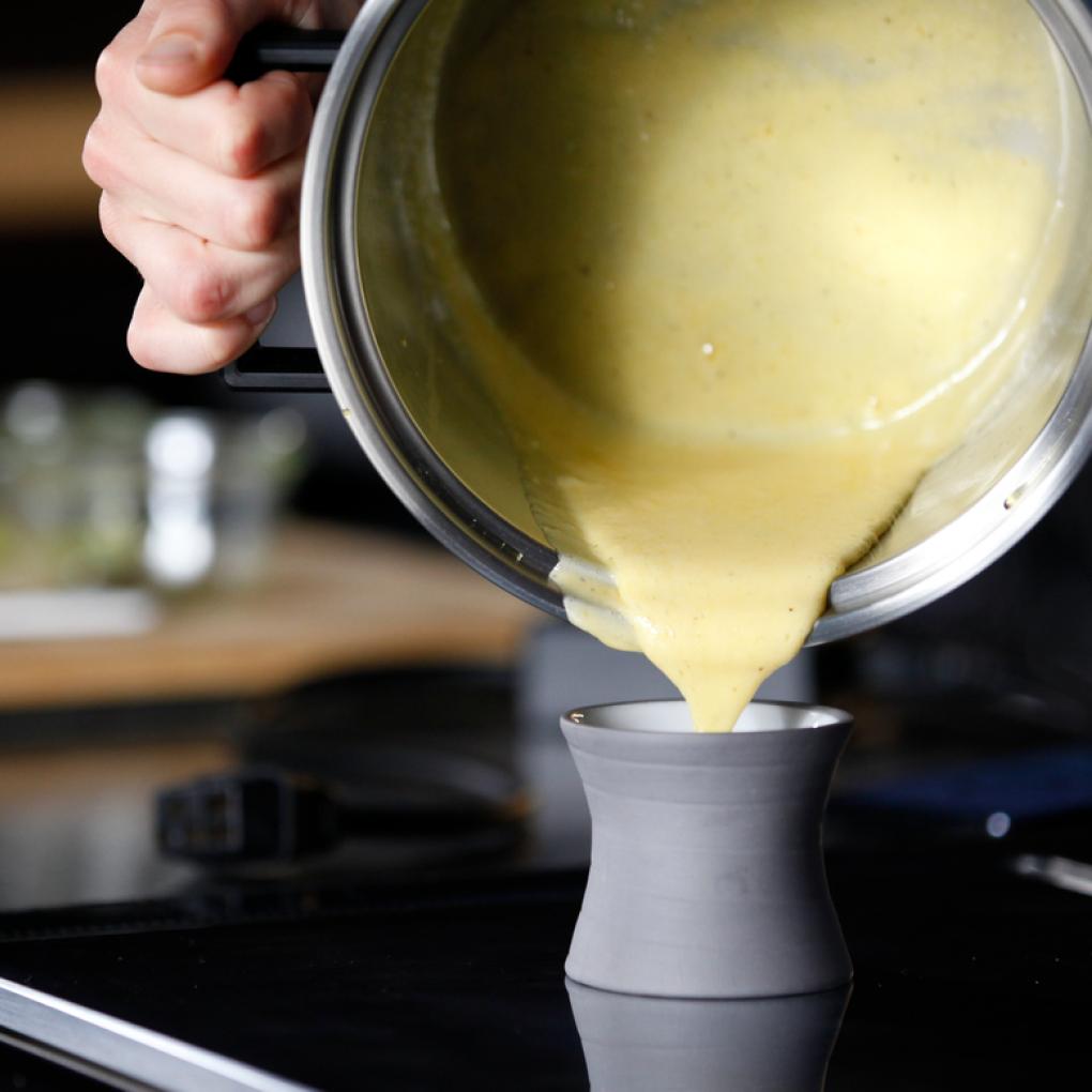 Dazu wird die Butter auf einem ca. 96 °C warmen Boden schonend geschmolzen (nicht im Programm enthalten). Der entstehende Schaum wird abgeschöpft. Der Prozess ist zu Ende, wenn die Butter nicht mehr dampft.