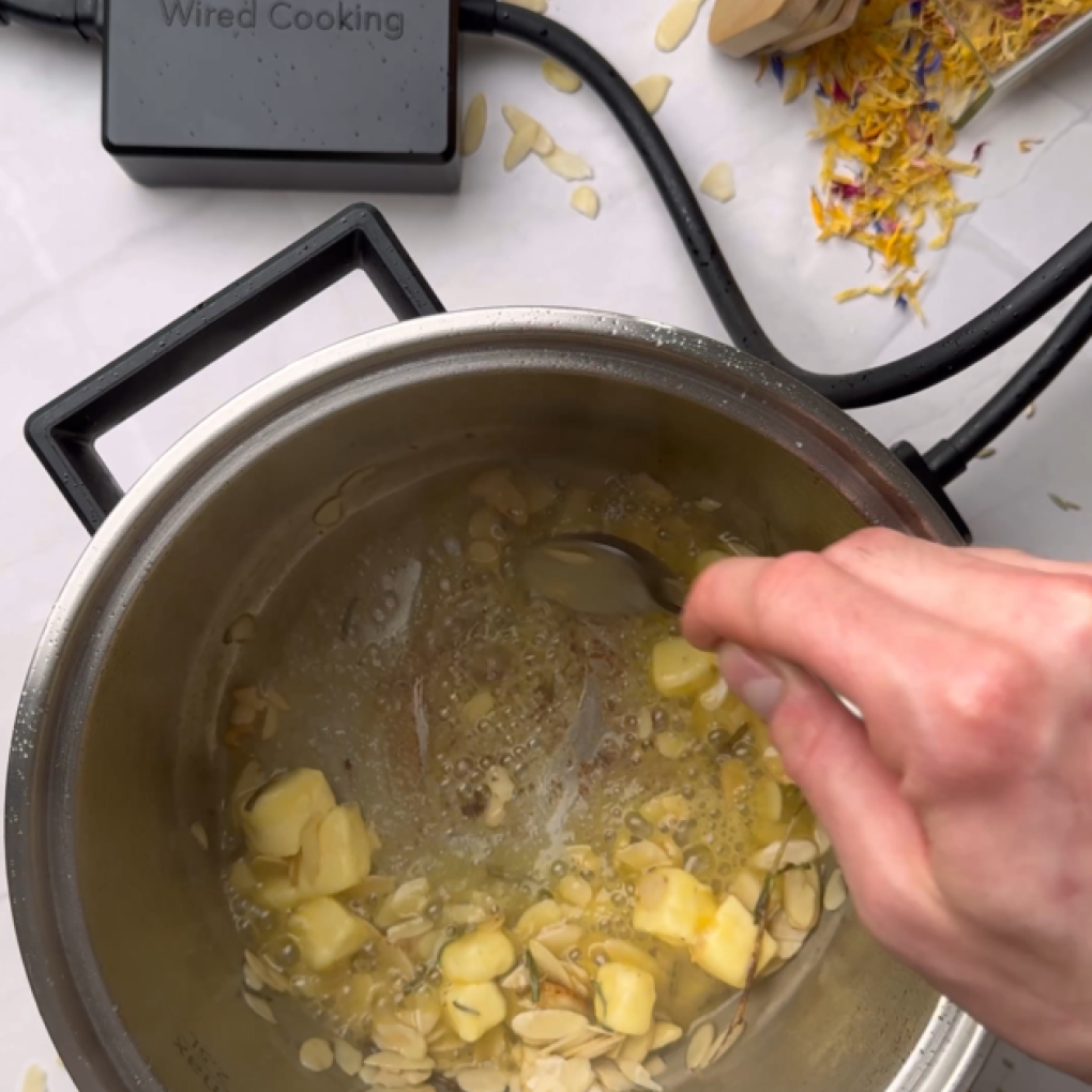 Jakobsmuscheln salzen und in etwas Öl bei 165°C Bodentemperatur anbraten. Angedrückte Knoblauchzehen und Rosmarinzweige beigeben (und eventuell bereits einen kleinen Teil der Butter). Nach 2-minütigem Braten die Jakobsmuscheln herausnehmen und die Mandeln, sowie die restliche Butter beigeben. Die Butter und die Mandelsplitter braun werden lassen.