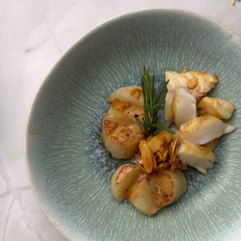 Zander Sous-vide und Jakobsmuschel mit Mandelbutter